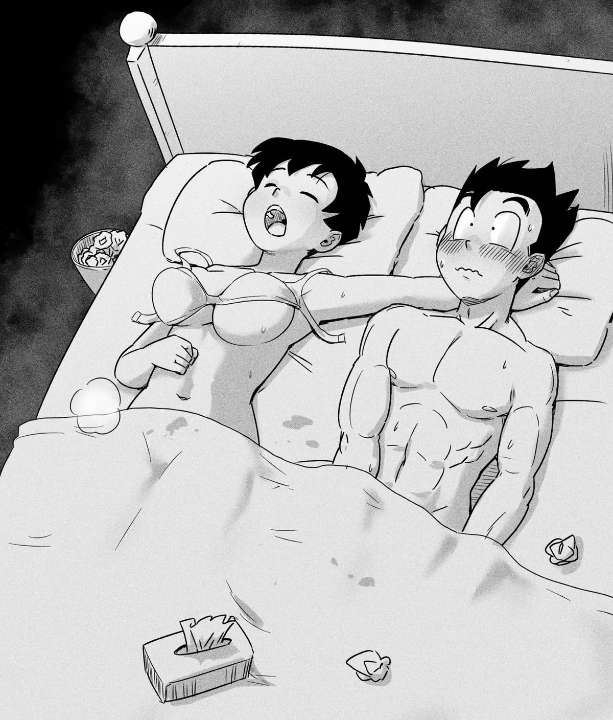 寝ているベジータの隣でウーロンと浮気SEXするブルマ